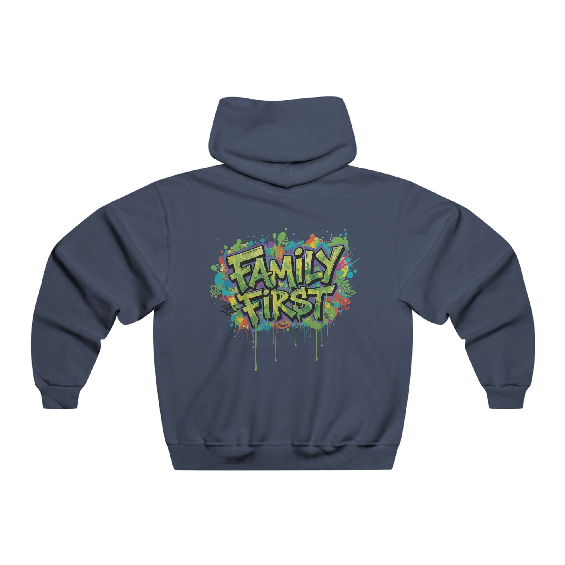 This cozy hooded sweatshirt blends street-art energy with everyday comfort. The front features a vibrant graffiti-style monogram that pops with layered greens and yellows, while the back showcases a bold "Family First" mural complete with paint-splatter details — wearing it feels like carrying your crew’s spirit with you. The roomy hood and kangaroo pocket invite you to curl up on cool mornings or layer it for city nights. Loose-fitting and medium-heavy, it drapes easily over jeans or joggers and becomes a go-to for relaxed weekends, neighborhood hangs, and family gatherings where comfort and personality matter.